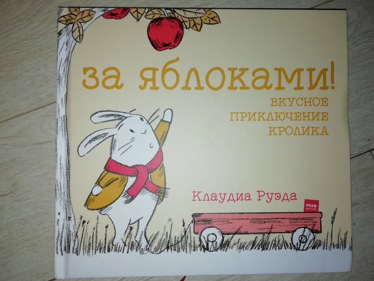 Помните книгу про Тюрлютуту, ту самую где нужно трясти книгу? У нас она зачитана до дыр. Книга "За яблоками! Вкусное приключения кролика" очень на нее похожа, здесь тоже нужно дуть, вертеть книгу и производить другие действия, чтобы помочь кролику собрать яблоки.