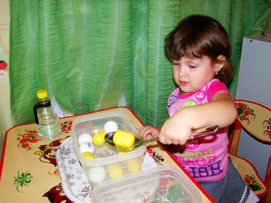 Задание такое - достать шумовкой мячики и киндер-сюрпризы, можно попросить одного цвета, можно вперемешку, Настена и просто руками не прочь, в общем если что-то просить и вмешиваться, по времени гораздо меньше ребенок занимается, чем если он сам будет что-то придумывать и выполнять свои собственные задания.