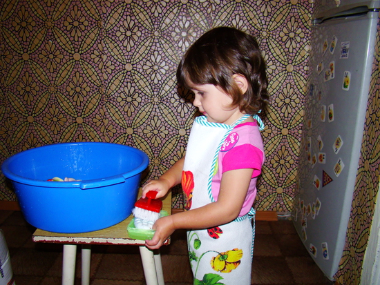 Достали фартук прорезиненный, чашку, мыло, щетки (все как в школе), Настюша сама донесла из ванной ведерко с водой, сама выливала, немного пролила на пол - пошла за тряпкой - вытерла