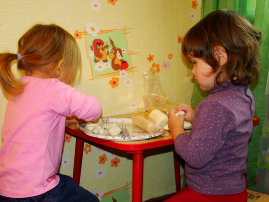 Мы еще толком ничего конкретного не лепили, просто возится как хочет с тестом, я особо не вмешиваюсь. Пока просто баловство!)))