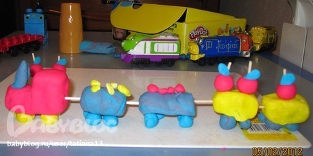 Сегодня Эль затребовала лепить паровоз, потом собаку и под занавес попугайчика "Голубчика". На птицу моей фантазии уже не хватило, но совместными усилиями пес-барбос ожидает паровоз на веселой пластилиновой станции!