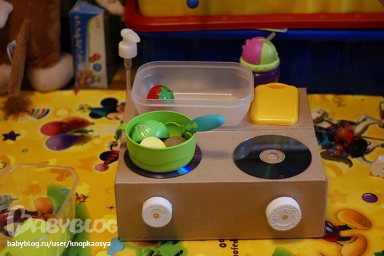 Плита с раковиной и краном , все как полагается и всего за пол часа, а главное не разрезав коробку, т.к. на след день можно из неё что-то другое смастерить!