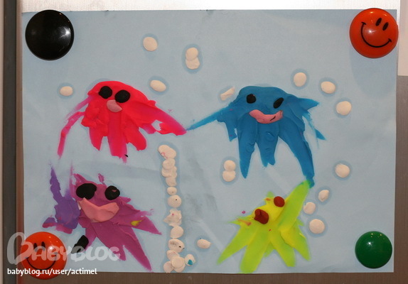 А эта моя любимая - вчера делал. Семья осьминожек: мама, синий даня, фиолетовый папа и Горох. только вот что-то все у него держатся за ручки, кроме братиком..хм
