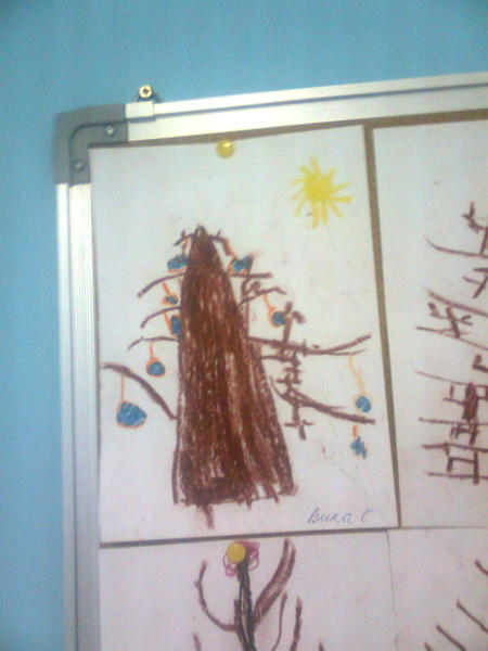 этим рисунком я прямо горжусь, т.к. Вика единственная в группе проявила креатив и украсила свое дерево шариками, а еще подрисовала солнышко))