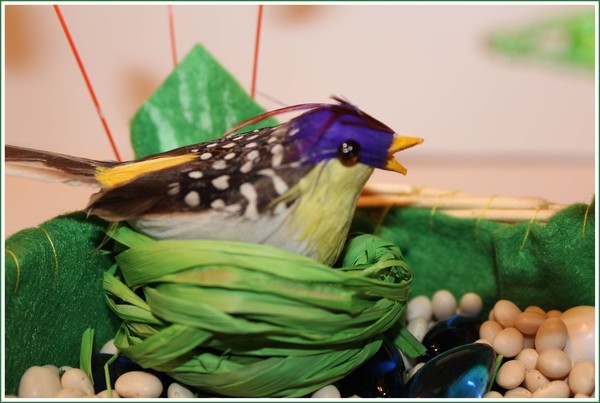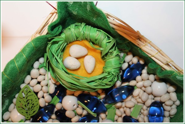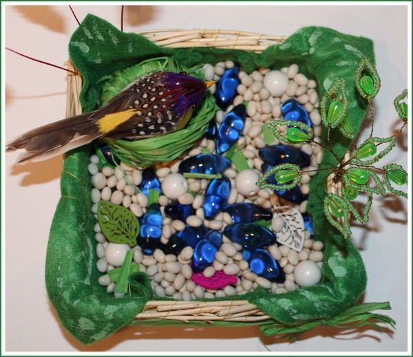 Доченька с удовольствием все содержииое коробочки, корме фасоли, выкладывает на стол в разные кучки. Птичку кормит ее же яйцами и стеляшками )) А в гнездо ей подкладывает "кукушкины" яйца - всё те же стекляшки ))