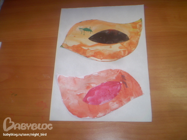 птички - сувенирчики, двухсторониие, разноцветные, птенец их разукрашивала, а мама вырезала, крылья потом приклеили, глазки дочка рисовала, у нас вообще ни одно существо да и предмет не может остаться без глазок, но в этот раз я предложила усложнить задачу и нарисовать закрытое веко с ресничками, за идею (простую форму птичек) спасибо свете