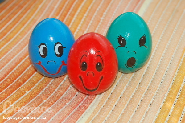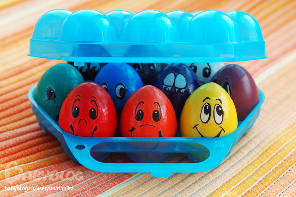 Всего 10 яичек: 7 яичек с основными цветами - Каждый Охотник Желает Знать, где Сидит Фазан + 3 дополнительных яичка - черное, серое и белое. И у каждого яичка свое выражение лица - изучение эмоций. Конечно больше улыбающихся рожиц, но у всех даже улыбки такие разные!