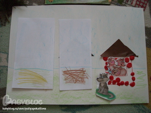 Решили мы построить им домики сами. Первый домик из соломы (макароны, прикленные на двусторонний скотч, и крыша из цветной бумаги. Второй домик из веточек (рваные полоски цветной бумаги и крыша из нее же), третий дом из кирпича (пластилин).