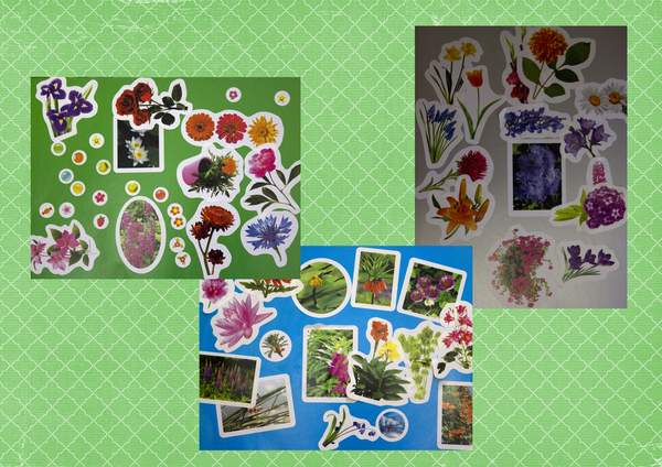 Наклеек в книге очень много, мы из них соорудили 3 цветочные полянки.