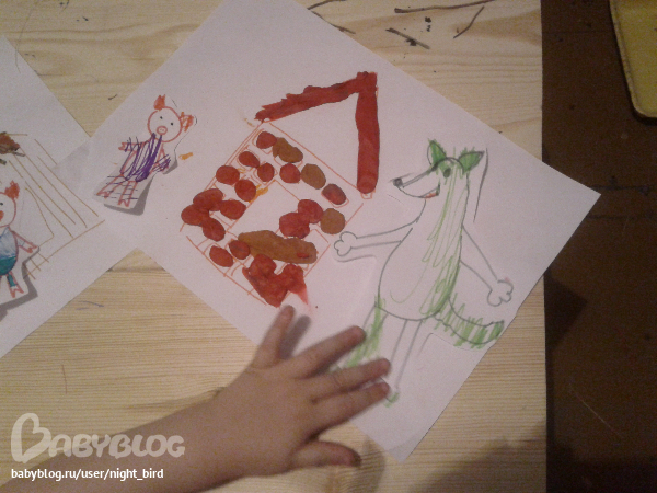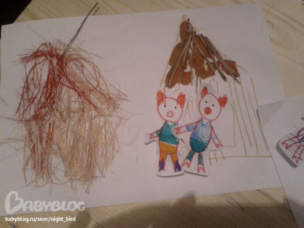 поросят нарисовала на скорую руку, просто чтобы было для кого "строить" домики но дочке они жутко понравились, она их разукрасила и затребовала нарисовать волка. В общем домики делали быстро, чтобы скорее играть поросятами, даже на следующий день хотела их взять в садик))) вот так, детям нравится не дорогое и реалистичное, а простое, но сделанное с мамой)))