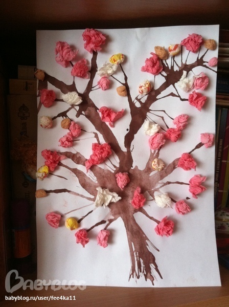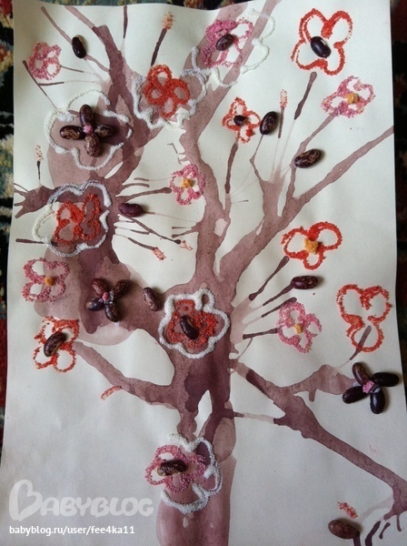 Очень понравилось нам делать цветущие деревья. Сами деревья делаются методом кляксографии, что само по себе интересно, главное заранее проверить, умеет ли ребенок дуть!!! На листе бумаги раздуваете с помощью трубочки для коктейлей краску или тушь канцелярскую, в форме деревца, на мой взгляд, это самый лучший способ рисовать деревья, веточки очень естественные получаются. А дальше на сколько хватит фантазии: у нас вот что получилось: