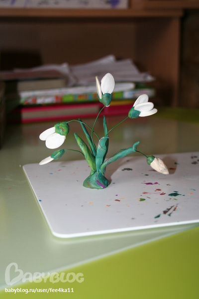 Лепили подснежники из пластелина с использованием тыквенных семечек и проволоки