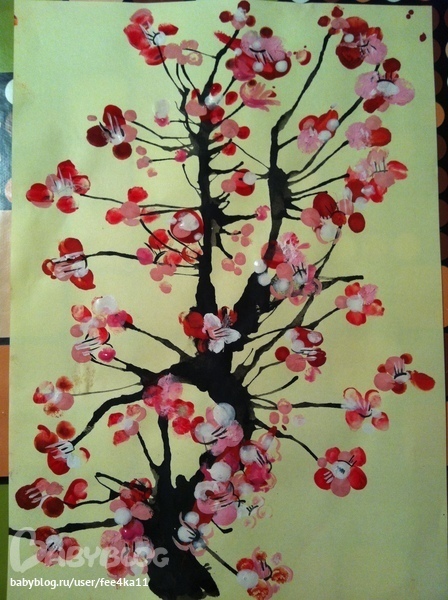 Рисовали гуашью как всегда: мама открывает краски, смешивает если надо, а ребенокрисует как заблагорассудится (и руками- на первом внизу видна ладошка, и пальцами и кисточкой), а потом мама дорисовывает детальки (веточки, листочки и цветочки на последнем рисунке я просто показала как и где и ребенок сам смог)