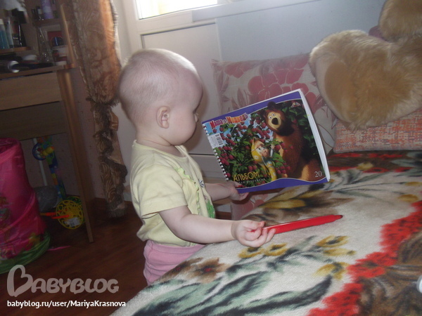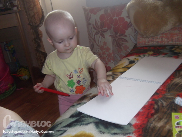 мы тоже уже обзавелись бумагой и карандашами,правда мы используем полицветы,они на себе не рисуют))))пластилин тоже начинаем осваивать,правда пока только мама летип колбаски,а Наська их рвет на кусочки,пальчиковыми красками пока не обзавелись(