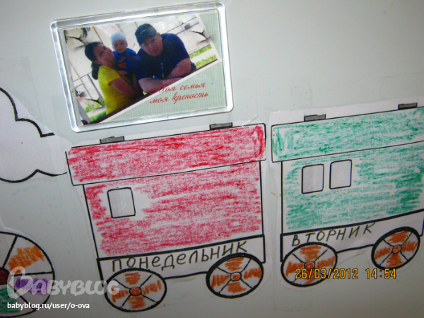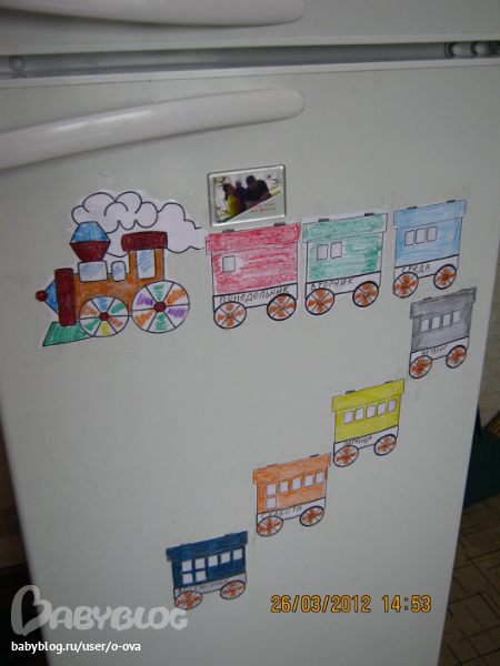 Паравозик "Дни недели". Вырезаны из бумаги и приклеян на холодильник. Каждый день разным цветом, например, понедельник - красный, в этот день стараемся одевать одежду соответсвующего цвета. Какой у нас сейчас день недели обозначает магнитик с нашей фоткой