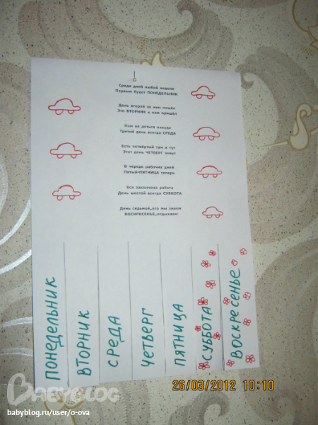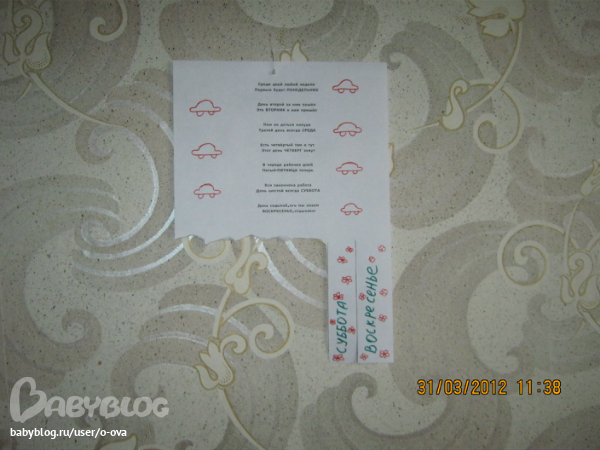 Отрывной календарь "Неделя". Стишок о днях недели, а снизу по типу объявления листочки с днями недели, отрывали их каждый вечер, обозначая, что еще один день прошел