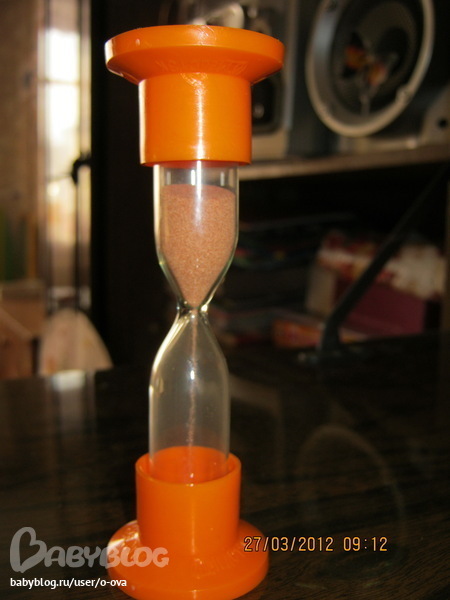 В качестве новой игры появились у нас песочные часы. Ну,сказала,конечно,что,когда песочек пересыпется пройдет минута.Однако пока основное предназначение - воспитательное.Когда мне надо что-то сделать,мы ставим часики и я прошу подождать минуточку,посмотреть,как песок пересыпется.