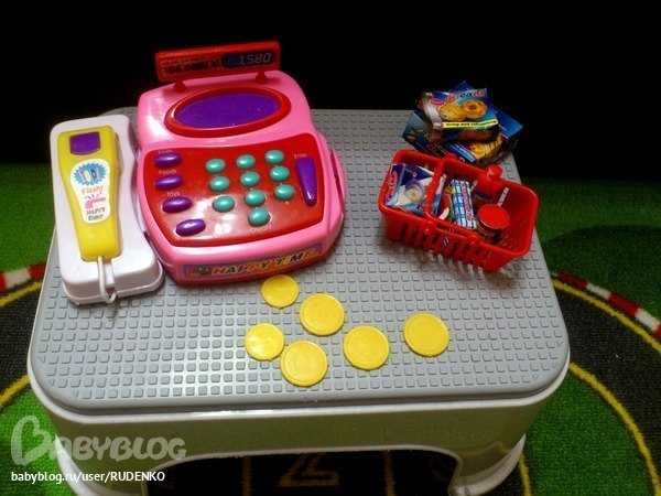 Игры и игрушки для детей от 2х-до 3-х летОчень советую)) Всего 250 рублей,а ребенок счастлив и очень увлечен.В такую дурацкую погодку, когда особо не погуляешь самое оно.Привлекли бабушек-дедушек, натащили с кухни овощи, макароны, всякую лабуду и стали играть.В самом наборчике деньги, корзиночка, набор продуктов.Ну и сам кассовый аппарат)) На английском правда ((((( ну зато выучили как по англ привет-пока :)