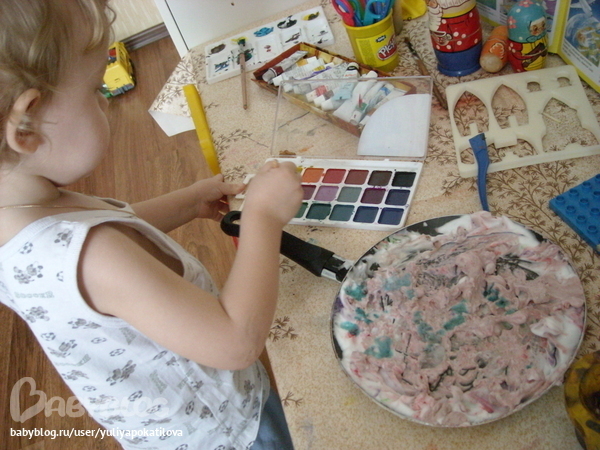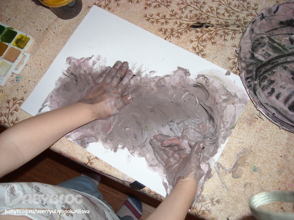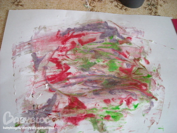 Снова отпечатали узоры :) В конце работы пену перемешали и руками начали рисовать ею на листе: