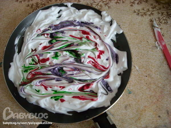 Затем, наносим краски (сначала мы взяли пищевые красители) и стекой немного смешиваем, чтобы получился узор: