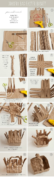 Работу по плетению корзинки начните из дна. Дальше плетите по фото-инструкции, которая увеличивается. Когда достигнете нужной высоты, заверните края и зафиксируйте клеем. К боковым сторонам корзинки приклейте ручку. Дайте некоторое время, чтобы высох клей.