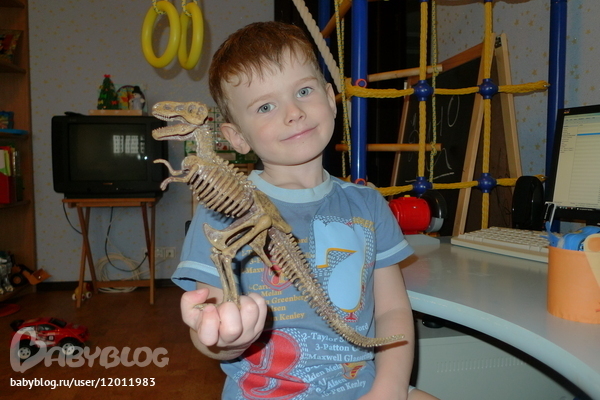 раскопки прошли хорошо, выбился нормально. Но в процессе сборки пострадал скелет - но мы его склеили? В процессе игры с ним уж хвост ломался(все таки эта игрушка - что б на полке стоять), опять его папа склеил. Нормально.