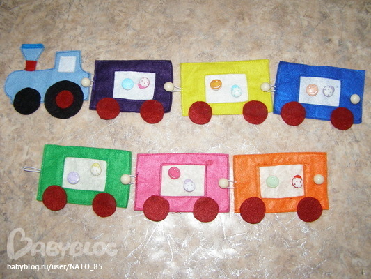 Сшила на скорую руку для Лизуньки паровозик. Пришила туда пуговки, но в процессе эксплуатации поняли что нужно, наверное, их отпороть, так как в вагонах у нас ездили наши животные)
