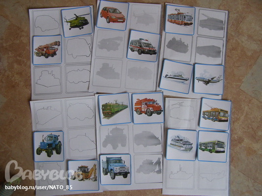 Нашла в интернете карточки + листы контуров и теней. Распечатала. Ребенок был счастлив! В первый раз, правда, спутала контуры трамвая и троллейбуса, но потом уже видимо запомнила и очень точно все складывала. Причем сами карточки нам пригодились и просто отдельно. Мы их сортировали по группам, обсуждали, кто как ездит, кого возит, какие звуки издает и т.д.