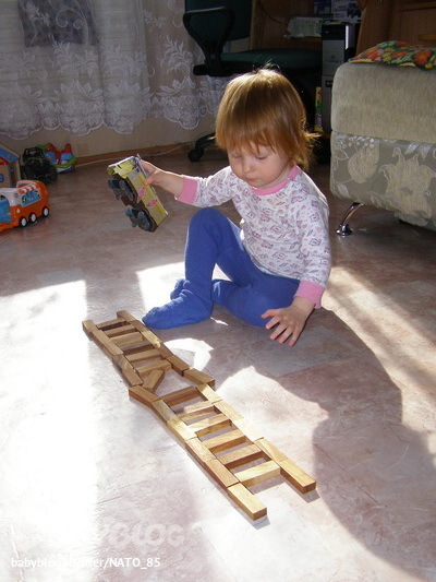 6. Из деревянных палочек от игры «Башня» строили подобие жд дороги для поезда. Правда она ну очень быстро приходила в негодность, потому как поезд у нас был совсем какой-то «бульдозер»– все сметал на своем пути)))