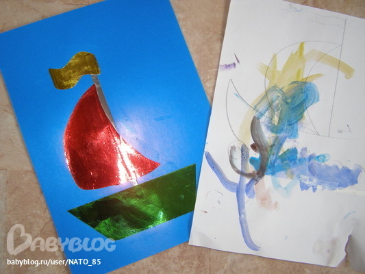 Из водного транспорта у нас теперь есть вот такие кораблики: один сделан из разноцветной фольги – мамой – Лиза дала и мне возможность поклеить (почему – то наотрез отказалась делать сама и заставила все клеить меня), второй ее творение красками.