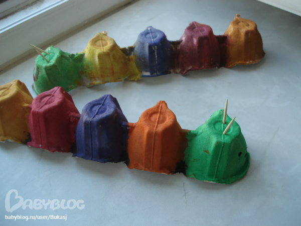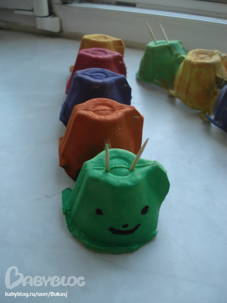 Сделали гусеницу из тары для яиц. Ничего сложно, а весело))) Лучше брать тару где 3 десятка яиц....там более аккуратнее вырезается гусеница. Первую мы с Платошкой делали, вторую нам сестра семилетняя сделал...