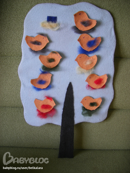 еще я сделала наконец-то счетное дерево с птичками из фетра. Пока дочкам очень нравится отклеивать птичек и лепть их обратно, потом думаю научимся каждую птичку сажать на гнездо нужного цвета