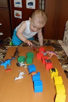 Т.к. у нас сейчас в большом уважении фигурки животных, игра была придумана с их использованием. Фигурки расставлялись по цветным кубикам и я просила дать какую-либо фигурку с определенного кубика. Попадания в цвет случались)))