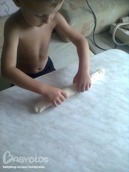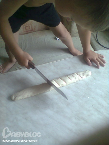 Рецепт теста взяли в инете (мука, вода, соль). Разминаем тесто, раскатываем колбаску. Делаем надрезы.