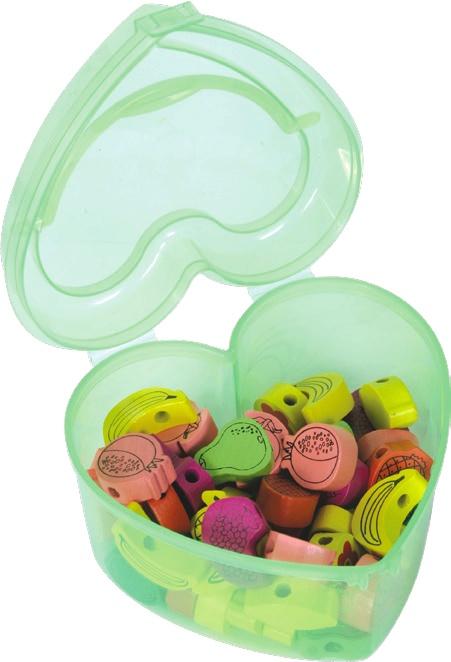 2. Бусы (фигуры фруктов, 60 деталей) в пластиковом боксе. 2 шнурка, с одной стороны шнурка есть деревянная палочка (более легкий вариант), а с другой стороны без палочки. (виноград, клубника, банан, яблоко, арбуз, ананас, перец болгарский, лимон, гранат, груша).