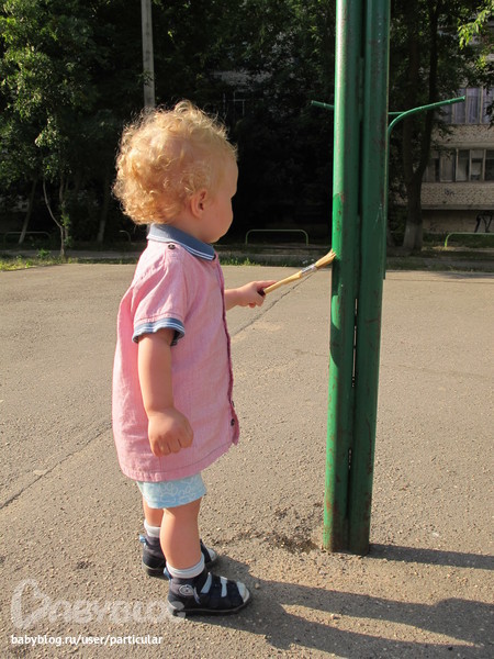 Взяли с собой ведерко, малярную кисть и бутылку с водой, планировалось порисовать на асфальте, но сынуле так понравилось, что он начал раскрашивать водой близ стоящие столбы))))