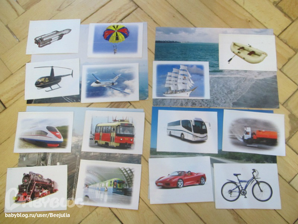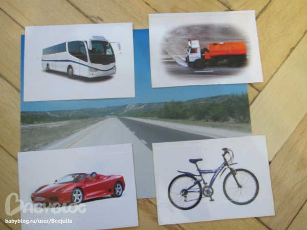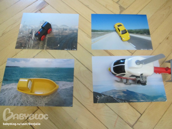 Распечатала фотки большого размера, которые стали нашим игровым полем. В основном пользуемся картинками, но и еще и фигурки расставляем. Хочу купить маленькие фигурки транспорта и тогда с ними играть.