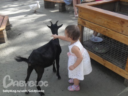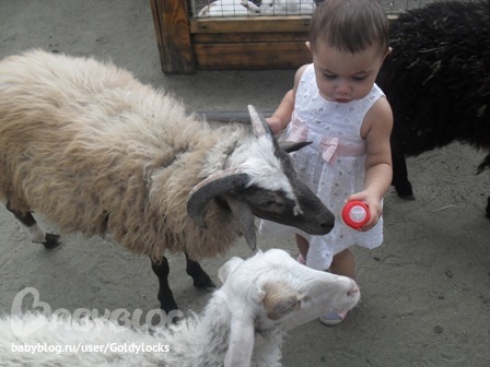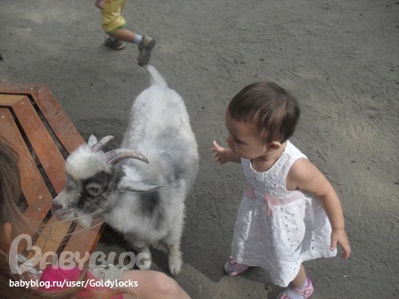 Козочку Света сразу узнала!!!! Мекала)))). А серый козленок оказался очень игривым! Рожки его так и хотели кого-нибудь забодать. Но Света не растерялась. Выполнила свою любимую "козу" пальчиками как из.