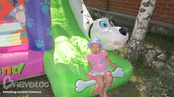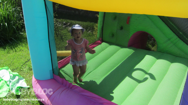 Подвижные игры и спорт ( зарядка, игры на улице и в в воде, танцы, игры с мячом и.т.д.)Батут и горка надувные - Алиса по долгу лазала, скатывалася, прыгала, очень ей понравилось