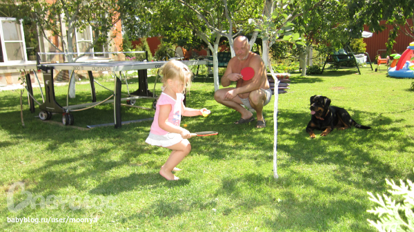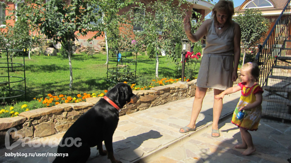 Дрессирует собаку с бабой Галей, очень эмоционально это захватывало Алису, аж прыгала от удовльствия