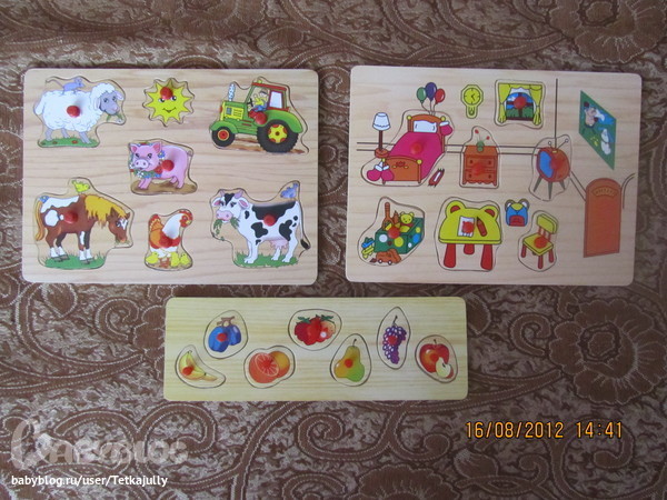 Развивающие игрушки (пазлы, вкладыши, конструкторы, мозаики)подкупила разных рамок-вкладышей. дочке нравится с ними заниматься. попасть точно в ячейку еще не может. просто берет картинку и ставит на то место где она должна быть. а то что ее нужно поставить в гнездо, она еще не понимает