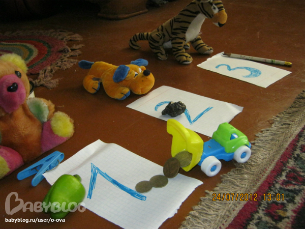 Магазин. Из каталогов вырезаны разные продукты и другие товары и наклеены для прочности на картон. Рядом с каждой картинкой точки. От одной до трех. Ребенку выдаются монетки. Он или игрушка приходят за товаром в магазин и чтобы купить что-то нужно отсчитать определенное количество монет.