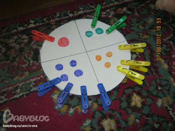 Смысл игры прицепить правильное количество прищепок и соотнести их по цвету