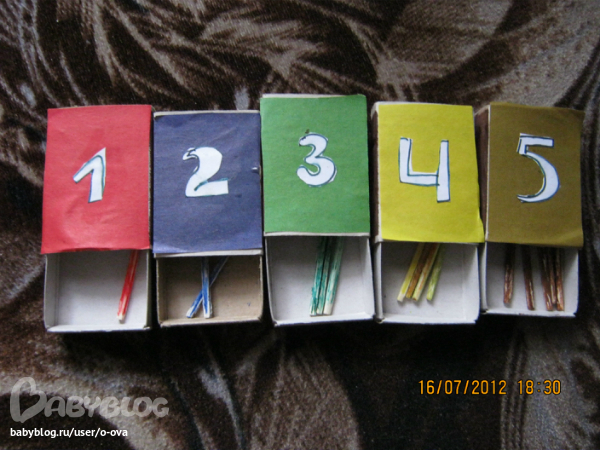 1. Сортиловка из спичечных коробков с палочками. Идея очень простая. Коробки обклеиваются цветной бумагой опрделенного цвета, внтурь кладутся палочки(у меня спички без головки), которые красятся в цвет коробки. Спичек одного цвета ровно столько, сколько указано на коробке, одна красная, две желтые и т.п. Задача ребенка правильно разложить палочки по коробочкам, соотнося по цвету. Ну и считаем сколько палочек.