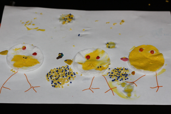 О, а это наши цыплята! Полностью творение дочки. Делала сама от и до, я лишь иногда подсказывала, что куда клеить. Но мастер подошел к делу со всей ответственностью, даже в конце накормила маленьких цыплят. Конечно, цыплята слабо похожи на цыплят, но тем не менее ))))