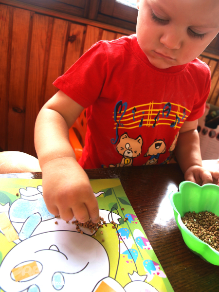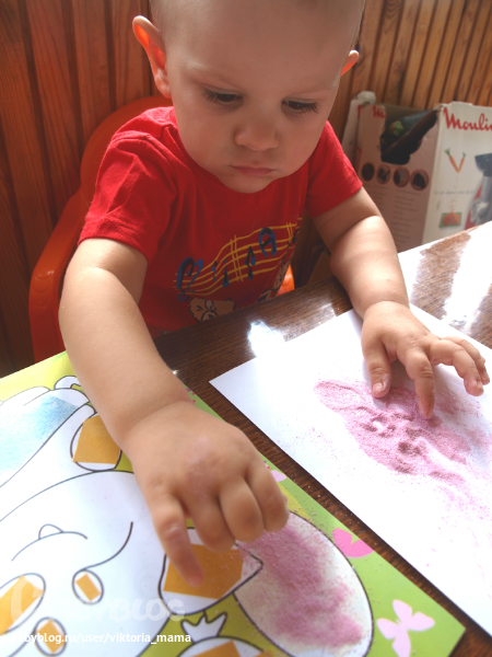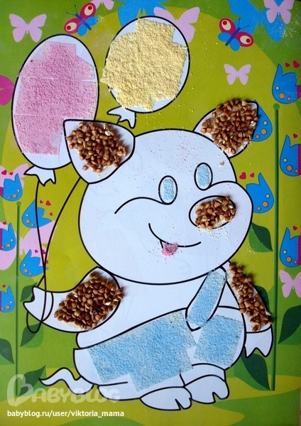 - разные крупы (мы использовали гречку, манку и мелкую соль, которую подкрасили с помощью мелков)