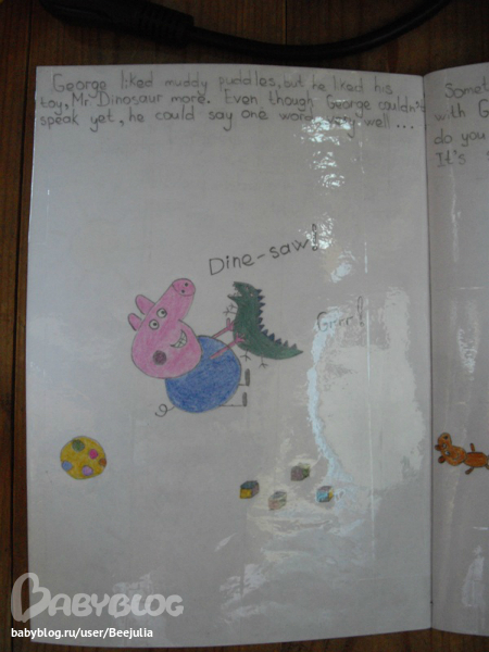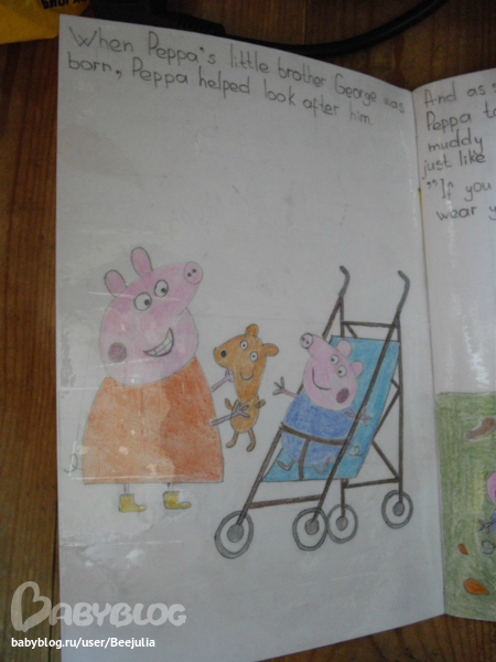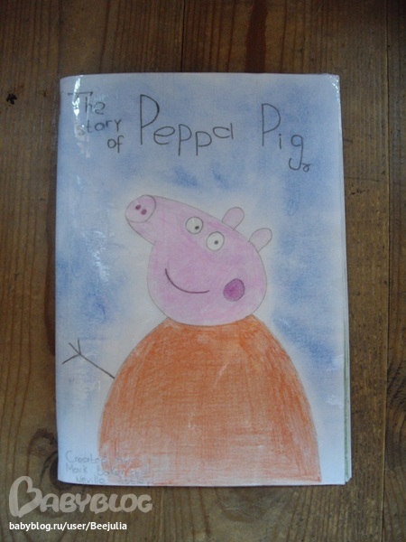 А сегодня Степка получил такой шикарный подарок от крестной и бабушки - самодельная книжка про Пеппу. Рисунки все рисовала крестная Степина. Книжка на английском языке. Все странички обклеены прозрачным скотчем. Она такая мягкая, с ней можно и спать и кушать, не боясь испачкать, а для моего книголюба это очень и очень важно, так как мы без книг никуда)))
