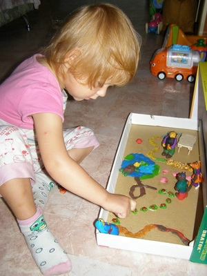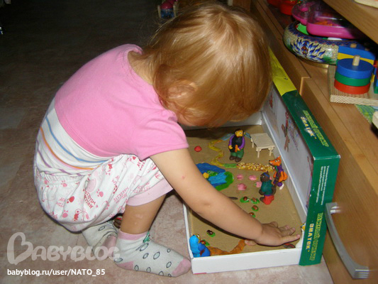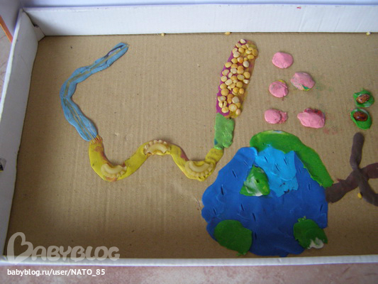 Дорожка сделана из пластилина с разными "препятствиями" для тактильных ощущений - здесь и спагетти, и макароны, и горох, и фасоль и просто пластилин.
