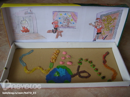 На одной стороне коробки, которая играет роль стены, появились "обои" в виде отрывков из сказки, а на "полу" путь по которому Буратино должен пройти до заветной дверцы. Путь этот не легок, так как его ожидают множество приключений - встреча с коварным Карабасом, хитрыми и жадными лисой и котом и конечно же Буратино найдет новых друзей, с которыми преодолеет все препятствия...