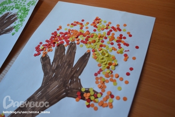 На листе бумаги обвела Василисину ладошку, раскрасила. Намазали с Василисой клеем карандашом маста, где должна быть листва. Насыпали конфетти сверху на клей, прижали немного, лишние конфетти стряхнули.